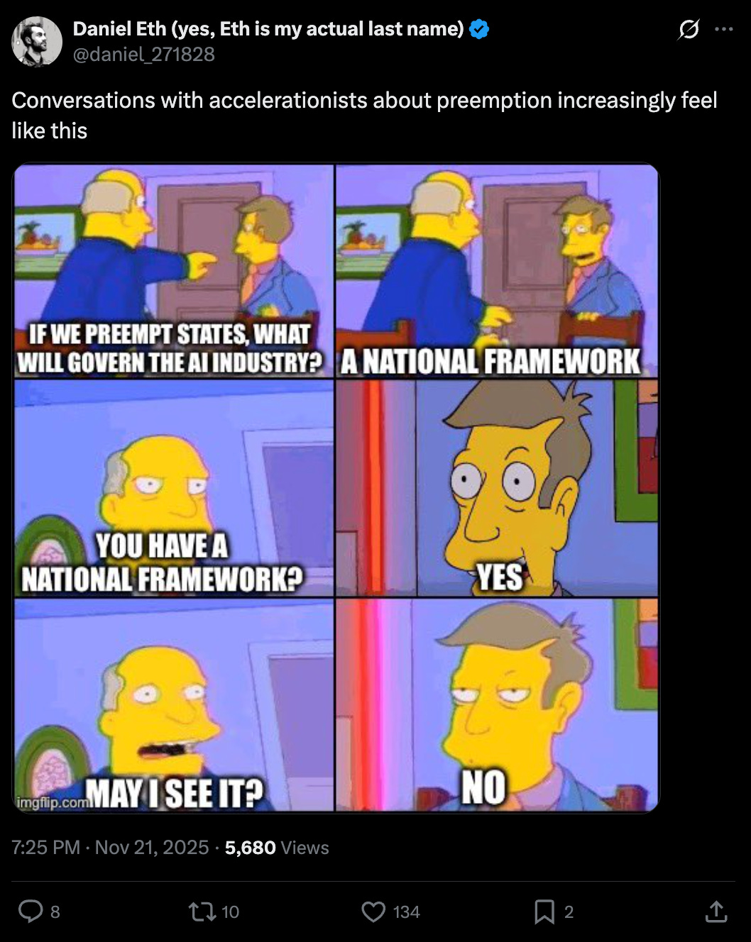 But so far, the administration has tried to ban state lawmaking without offering anything federal in return. For technology this consequential, states need to be able to act in the absence of federal measures.