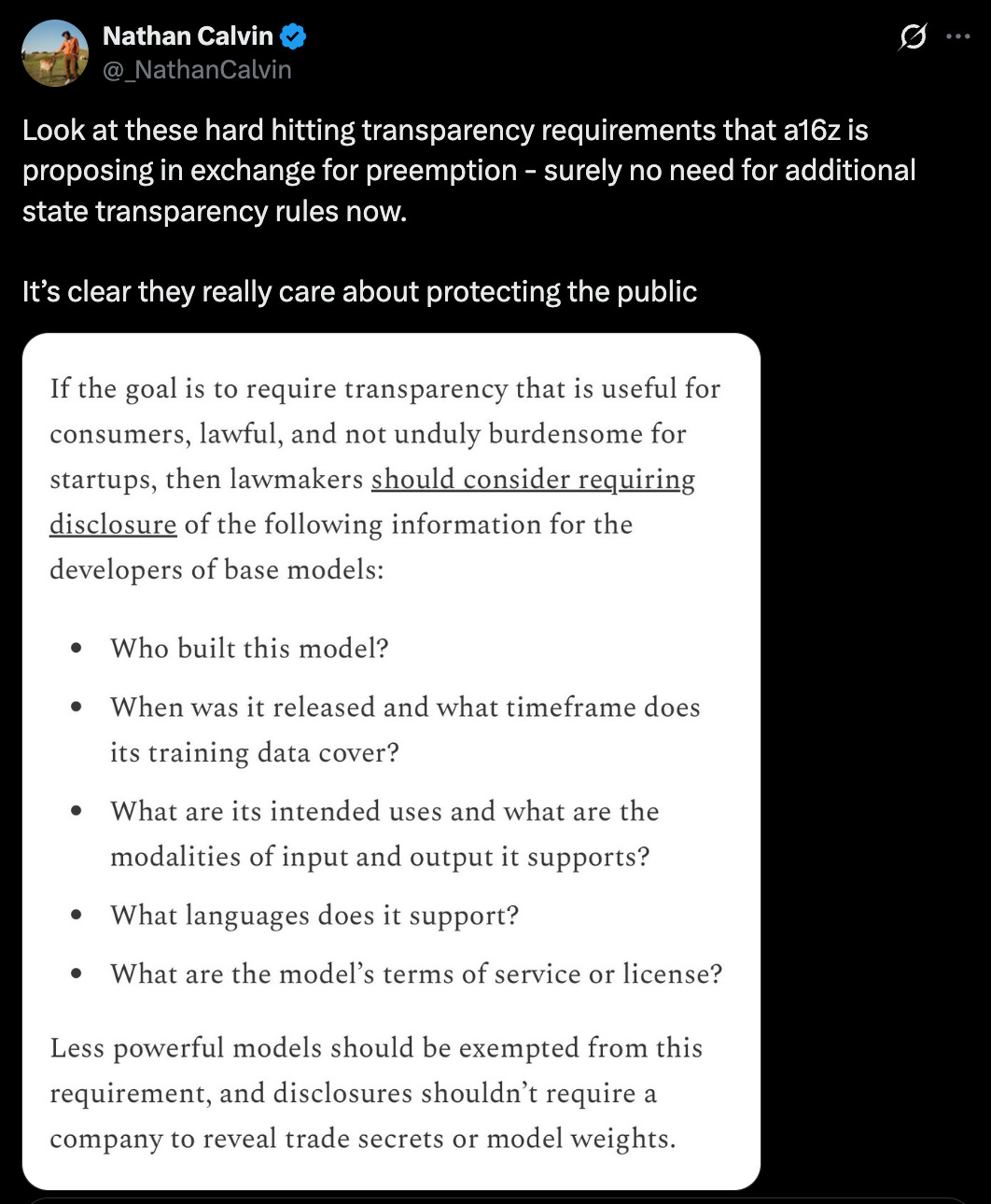 For instance, a16z was called out by Brookings for, at minimum, misunderstanding and continuing to assert incorrect details about California’s SB 1047, which was ultimately vetoed by Governor Gavin Newsom.