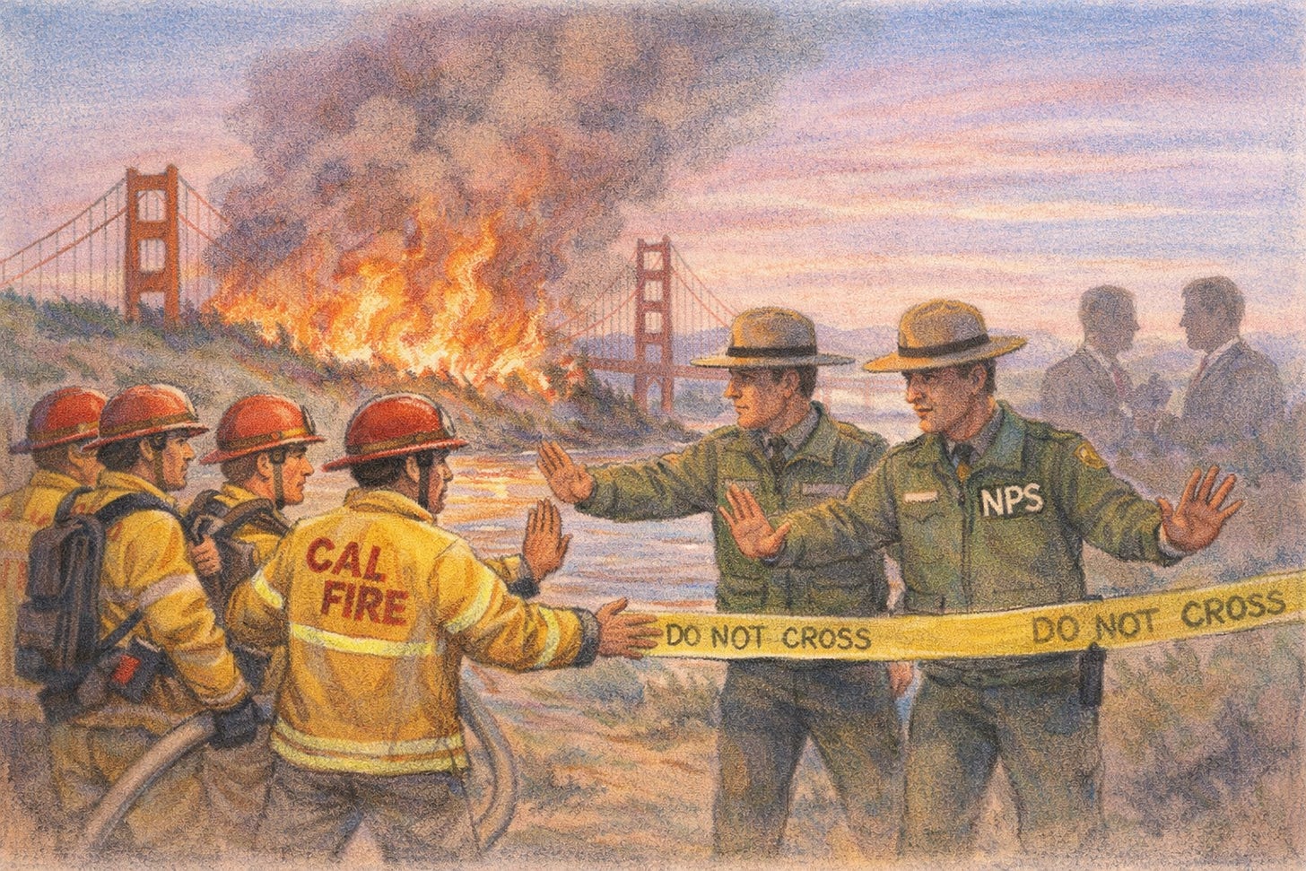 Imagine a fire blazing next to the Golden Gate Bridge. When California’s firefighters try to put out the fire, they’re told to stand down because the fire is, accurately, on federal land. But then the National Park Service just watches from a distance, as the fire burns hotter and larger.