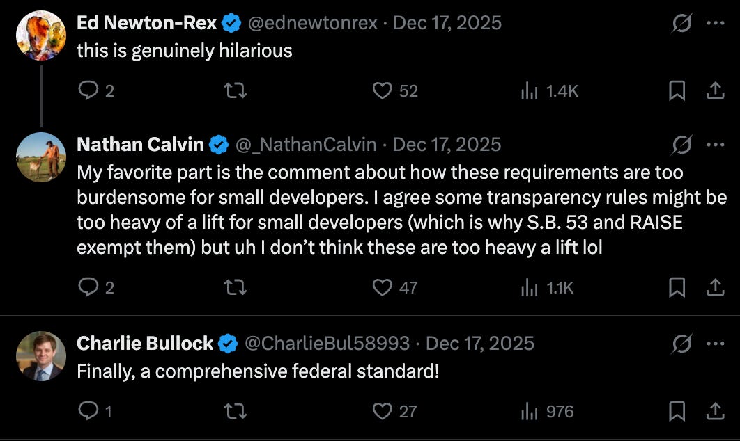 The Executive Order sets two deadlines, which will hopefully clarify their actual lawmaking approach. By mid-March, the administration will identify which state laws it claims violate federal AI policy. By mid-June, AI czar David Sacks is meant to consult with the FCC chair and decide on a ‘national standard,’ though what this will mean in practice is unclear — for instance, whether violating this standard would entail any penalties. I don’t expect it to, but I’d love to be surprised.